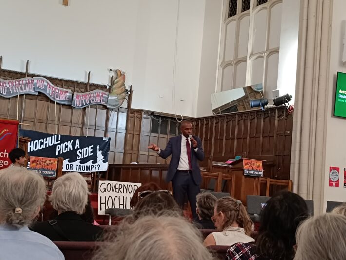The church was covered with protest posters including some that said, “Hochul! Pick a side, New York or Trump?” and “Hochul protect NYC, not Trump’s pipelines.”