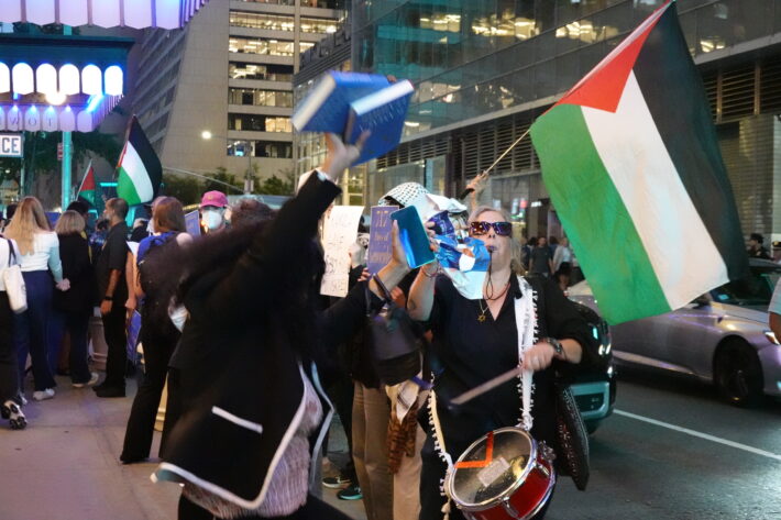 Outside a group of protesters waving Palestinian flags gathered by the entrance. One of the protesters who wore a Star of David around her neck was blowing a whistle, banging a drum, and crumpling two book covers in the face of a woman who was exiting the event. The attendee, in response, danced around the protester, waving her two copies of “107 Days” in the air.